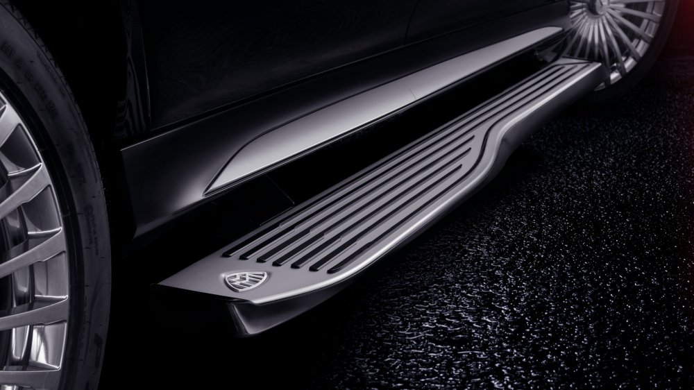 Процесс попадания в салон обставлен с особым шиком. При открытии дверей кузов приседает на 25 мм, и из порогов выезжают подножки из анодированного алюминия. Их длина – 2,06 м, ширина в широкой пассажирской части – 21 см, а контактная поверхность снабжена резиновыми противоскользящими ламелями. В тёмное время суток рядом с узкой частью подножки можно любоваться световой проекцией эмблемы Maybach на дороге. Подножки выдерживают нагрузку до 200 кг. В сложенном состоянии они никак не влияют на проходимость и не ухудшают аэродинамику кузова. Любители покрасоваться могут опустить подножки принудительно из салона и катить с ними на скорости до 15 км/ч. Опустить подножки на камни и прочие препятствия на бездорожье помещают датчики слежения, они же уберегут ступни и другие части тела от защемления в процессе складывания.