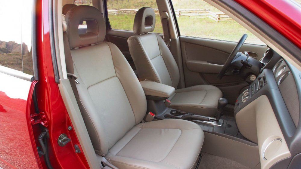 Если салон машины с завода обтянут «кожей», то вид её не порадует: заводской материал сильно вытирается на изгибах, подушка просаживается и сминается, на выступе спинки водительского сиденья и на стыке центральной и передней частей подушки швы легко рвутся. Боковина рвется у колесика регулировки.