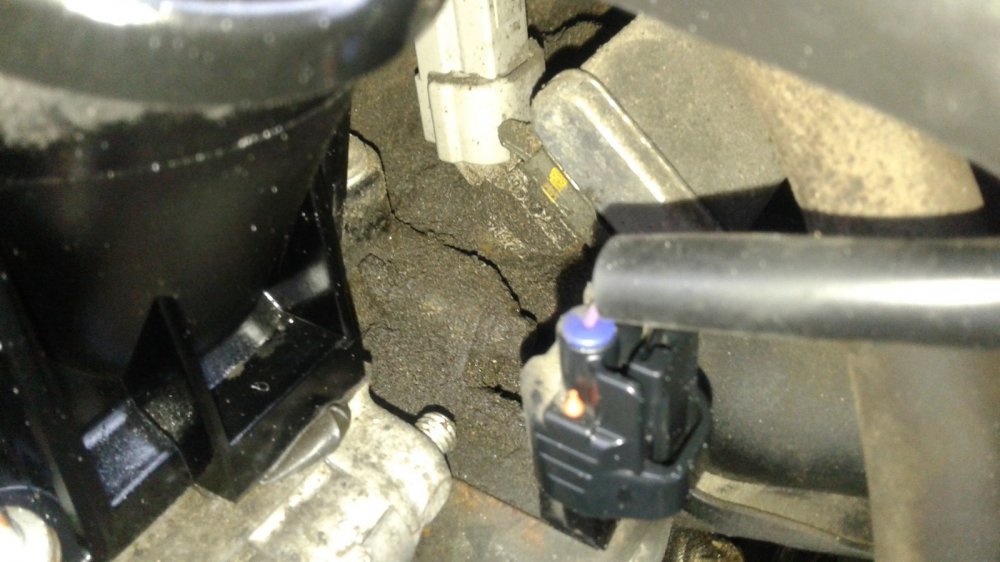 Ну, а теперь посмотрим мотор. Его, конечно попытались отмыть, но снять кожух у мойщиков духу не хватило. А зря. Тут очень заметное скопление грязи, годами налипавшей на масло, текущее из-под клапанной крышки.