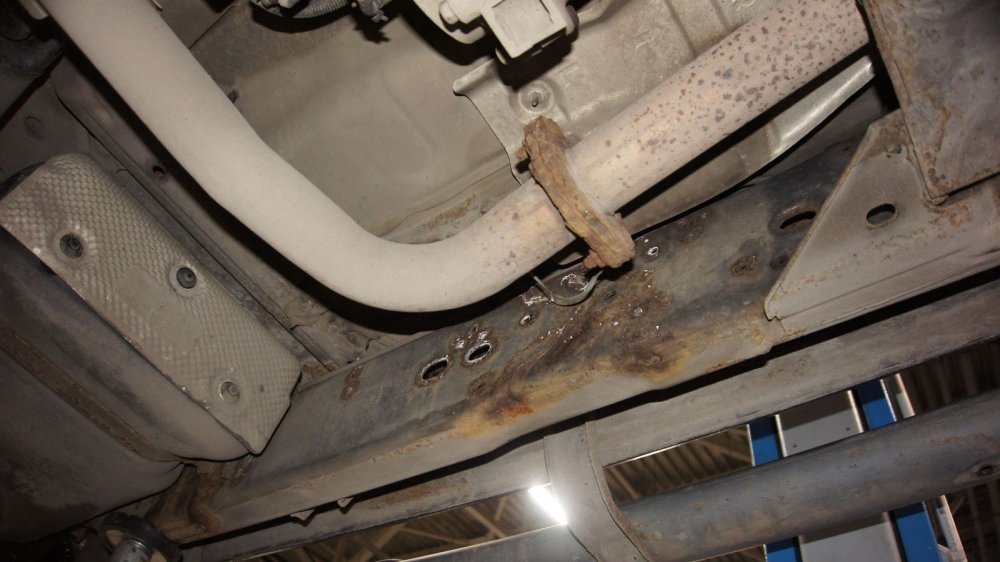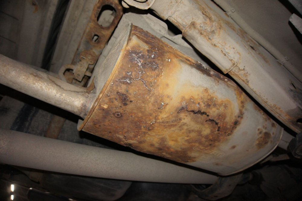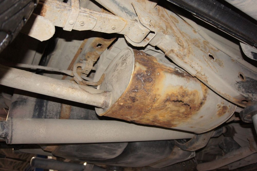 Выхлопная система – явно родная, и вот тут как раз есть некоторые нарекания. Первое, что бросается в глаза, это заметная сквозная коррозия банки глушителя. Впрочем, срочного вмешательства он как раз не требует, поскольку коррозионные трещины идут только по внешнему теплозащитному кожуху – из них не «сифонит». В дальнейшем, безусловно, придется либо купить прилично выглядящую бэушную банку с трубой (около 5 000 рублей), либо новый оригинал (около 40 000 рублей), либо новый неоригинал в полцены.