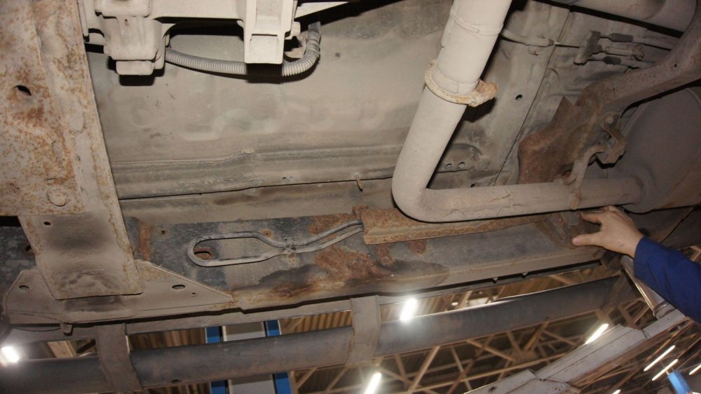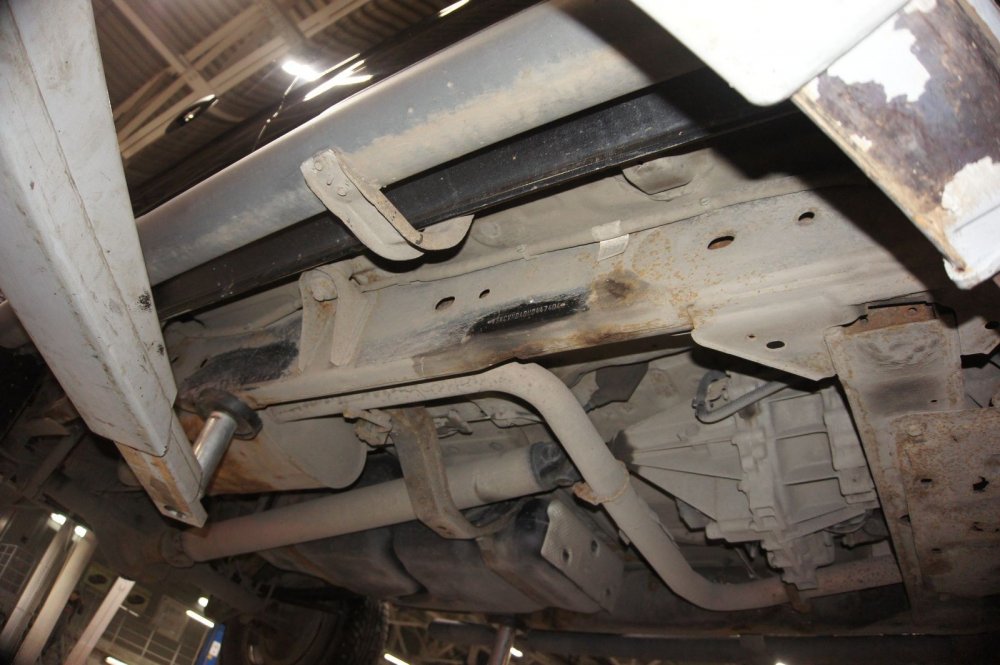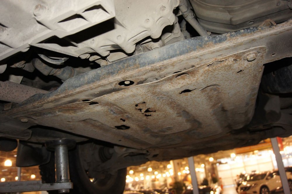 Отдельная история – защита картера двигателя и КПП. Двухэлементная защита сделана из стали, и коррозия сожрала ее буквально до сквозных дыр. А ведь металл там – миллиметра два! Беглый взгляд на защиту способен ужаснуть неопытного покупателя этой Navara, хотя, если приглядеться, ничего страшного нет: днище, пороги и рама пребывают в беспроблемном состоянии и не имеют ничего общего с прогнившими щитками.