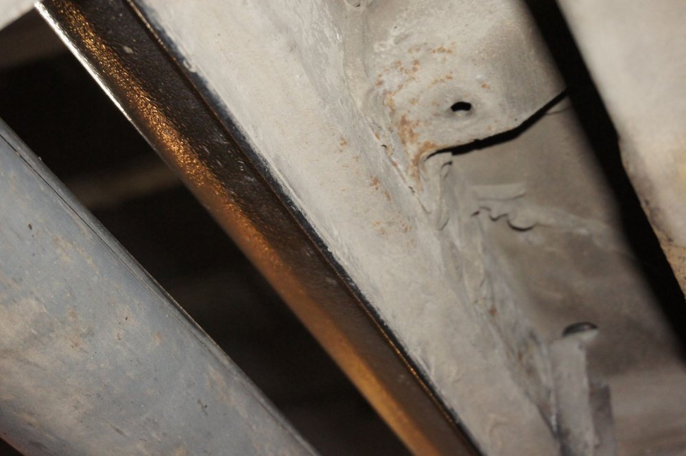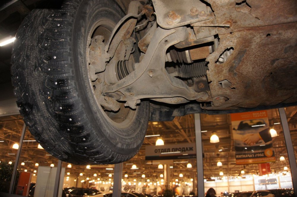 Пикап неплохо оцинкован: под единственным крошечным сколом краски на стыке арки и порога сзади справа видны цинковые «разводы». Аналогично защищены и Г-образные кронштейны крепления выносных порогов, несмотря на то, что пороги – неоригинальный аксессуар. Краска на кронштейнах полностью облезла, но под ней обнажился характерный «дамасковый» узор, образованный оцинковкой. Также сошло покрытие с опор алюминиевых рейлингов на крыше. Это уже вполне штатный аксессуар, но красить сплавы алюминия – вообще дело неблагодарное. Несколько повреждений от камешков или при погрузке, и под слоем краски идет коррозия с отслоением…