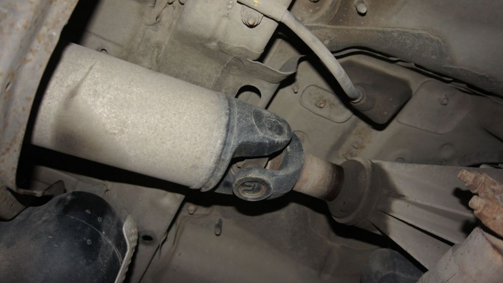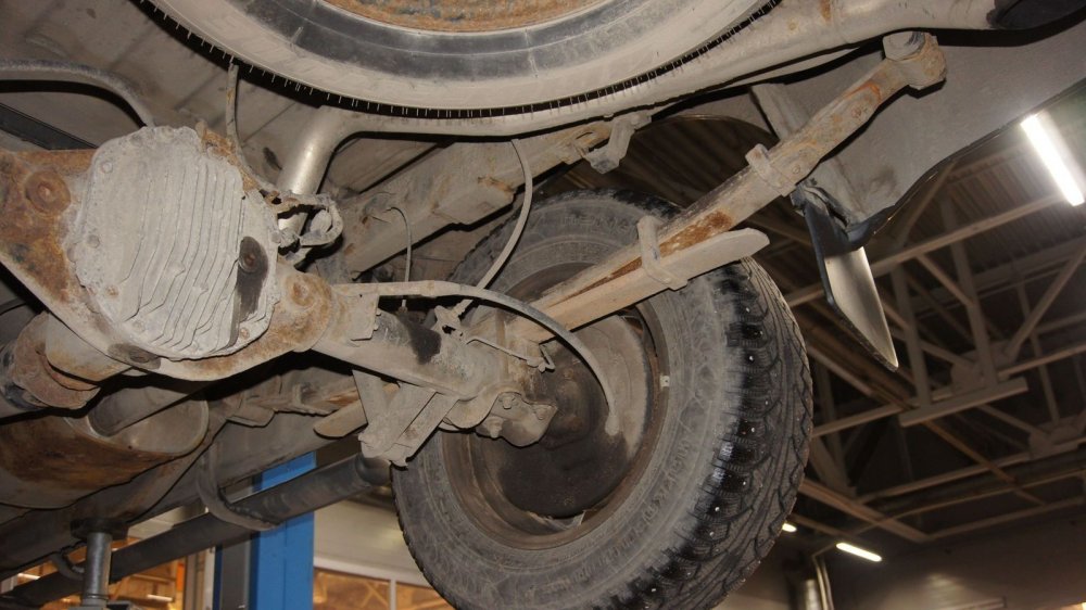 Задний мост – сама простота… Неразрезной, на продольных рессорах, без стабилизатора, с барабанными тормозами и простейшим прямым карданом без подвесного подшипника. К редуктору идут два провода с разъемами – на актуатор электроуправляемой блокировки дифференциала и на датчик ее включения. Поменять в таком мосту амортизаторы, колодки, и даже рессоры можно буквально на домкрате. Хотя делать в нем нечего – масло сменено (два литра 75W140 для редуктора с блокировкой – не путать с обычным передним редуктором, где используется традиционное 80W90!), тормоза обслужены, амортизаторы исправны, все сухо.