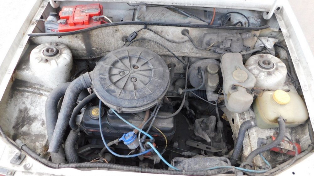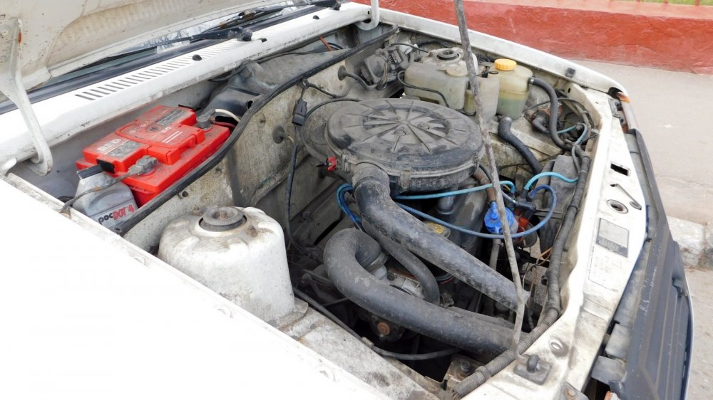 Теперь заглянем под капот. Мотор виднеется под слоем чудовищной грязи и разбрызганного повсюду масла. Да, перед съёмкой я съездил на мойку и вымыл кузов снаружи, но мыть моторный отсек не рискнул: чужая машина, всё-таки, не дай бог, потом не заведётся. И гарантии мойщики честно не дают. Но всё, что необходимо для самостоятельного обслуживания, разглядеть ещё можно.