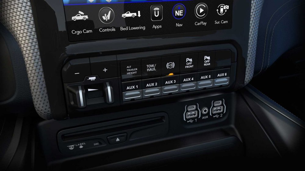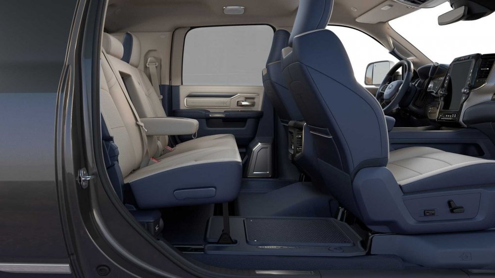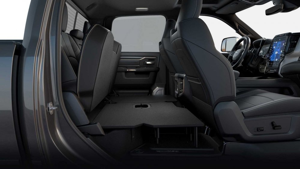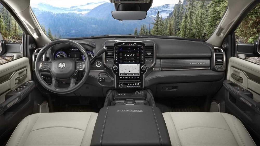 Кабина может быть одинарной, двойной или двойной удлинённой, с увеличенным запасом пространства для ног пассажиров. В списке опций значатся блокировки дифференциалов обоих мостов, лебёдка и навесная видеокамера, которую можно установить в любое место, чтобы, допустим, контролировать габариты прицепа. Задняя ось снабжена пневмобаллонами, поддерживающими постоянный дорожный просвет независимо от нагрузки. Поскольку закрытого багажника по умолчанию нет, то разработчики предусмотрели всевозможные ниши, карманы и полочки в кабине суммарной вместимостью аж 258 л. Топовая мультимедийная система Uconnect 4C NAV идёт в комплекте с роскошным вертикально ориентированным 12-дюймовым сенсорным экраном, на который можно выводить сразу два работающих приложения со смартфона. 750-ваттная аудиосистема Harman Kardon предусматривает аж 17 громкоговорителей в кабине, но она, разумеется, тоже из числа многочисленных опций.