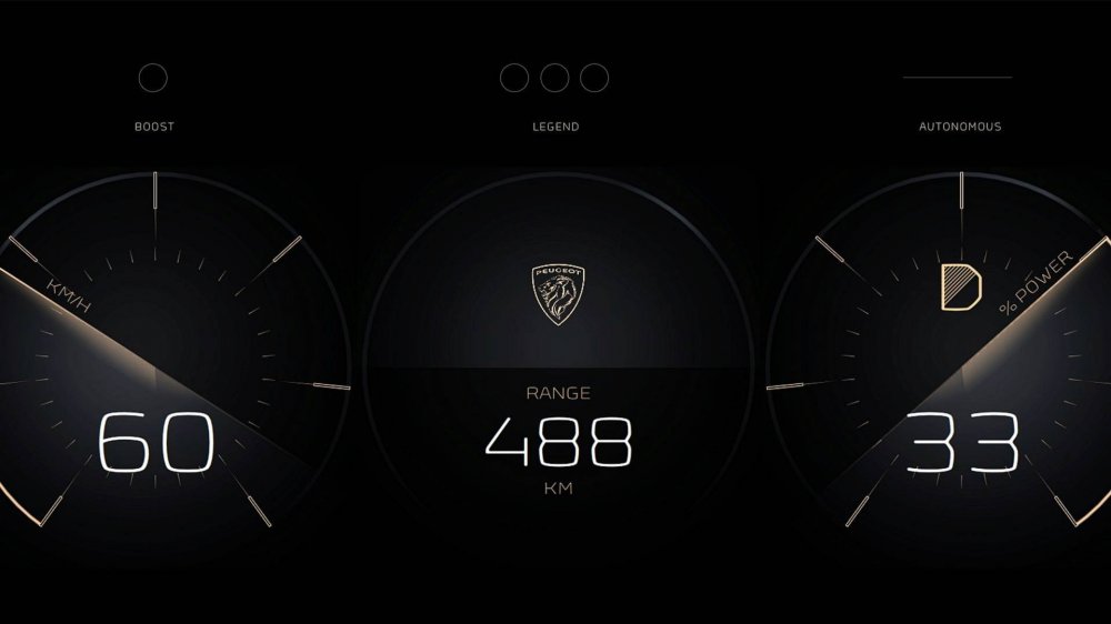 Режимы ручного управления – это Boost и Legend. Первый, как несложно догадаться, адресован активным водителям, и позволяет максимально использовать возможности электрической силовой установки (462 л.с., 800 Нм) и полноприводного шасси. На основной 49-дюймовый экран при этом транслируется изображение дороги. Первую «сотню» Peugeot e-Legend способен набрать менее чем за 4 секунды, максимальная скорость ограничена электроникой на уровне 220 км/ч.
