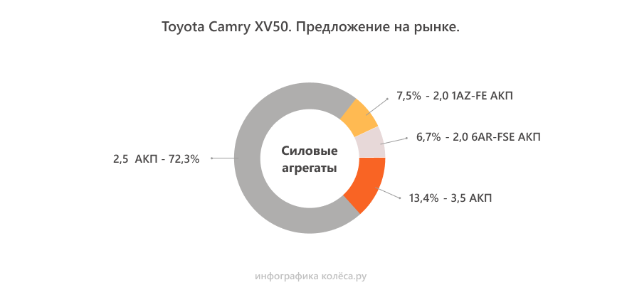 Линейка моторов на Camry XV50 довольно консервативна. Базовый мотор 2,0 1AZ-FE мощностью 148 л.с. машин до рестайлинга относится к той же серии AZ, что ставилась на два поколения ее предшественниц – XV30 и XV40. Новый мотор 2,5 181 л.с. серии 2AR-FE встречался и на американских XV40, но на российских машинах его стали ставить только на это поколение. Старый добрый 2GR-FE 3,5 277/249 л.с. остался прежним, модернизация была незначительной. Улучшили в первую очередь впуск и систему охлаждения, для улучшения равномерности нагрева. После рестайлинга 2014 года машины получили новый мотор 2,0 150 л.с. серии 6AR-FSE с непосредственным впрыском. Все двигатели очень надежны, хотя до идеала им достаточно далеко.