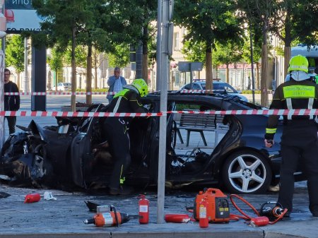 ДТП произошло рано утром 24 июня на Зубовском бульваре. Чёрный премиальный Mercedes без номеров на большой скорости пытался пересечь Садовое кольцо на красный сигнал светофора. Однако водитель не справился с управлением, вылетел на тротуар и врезался в здание. Сразу после этого машина загорелась.