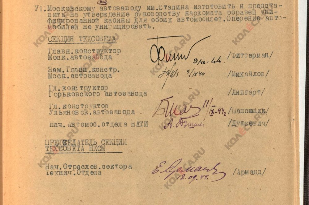 Таковых организаций три. Самая скромная роль – у Ульяновского ЗИСа, о чём мы расскажем ниже. Важным участником был НАТИ, а, точнее, Государственный Ордена трудового Красного Знамени Союзный научно-исследовательский и экспериментальный институт НАТИ, который сильно перевыполнил план: взялся изготавливать кабину, оперение и платформу, хотя Наркомат среднего машиностроения попросил сделать только шасси. Не забудем и про Московский ЗИС, задачей которого был выпуск двух кабин, предназначенных для отправки в Ульяновск. Московский завод тоже перевыполнил план, собрав ещё и два шасси! Об этом свидетельствует приказ Лихачёва по заводу (вероятно, его мы тоже выпустим в рубрике «Документ» с соответствующими комментариями).