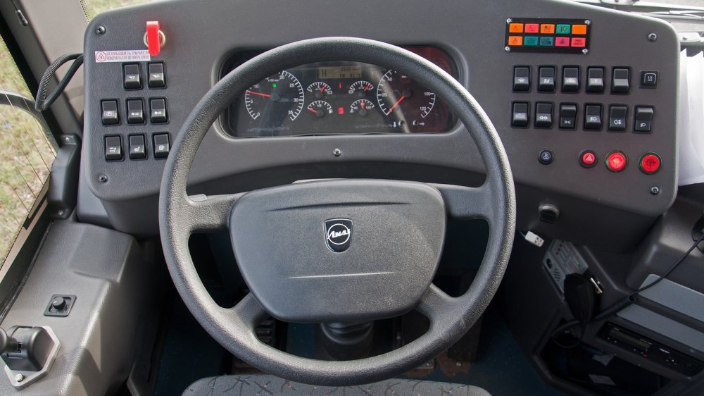 А вот коробка передач тут импортная ZF 6AP-1000B, но может стоять и американская Allison Т2100. Иностранная и рулевая колонка Continental, хотя сам рулевой механизм отечественный с изящной аббревиатурой в названии БЗАГУ ШНКФ 453461.400.