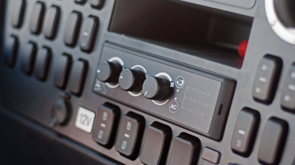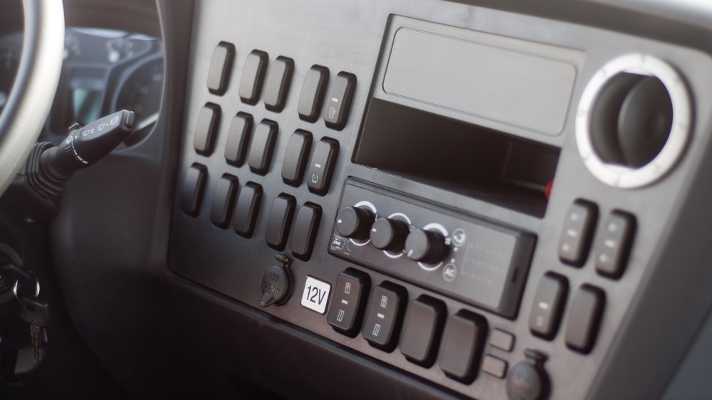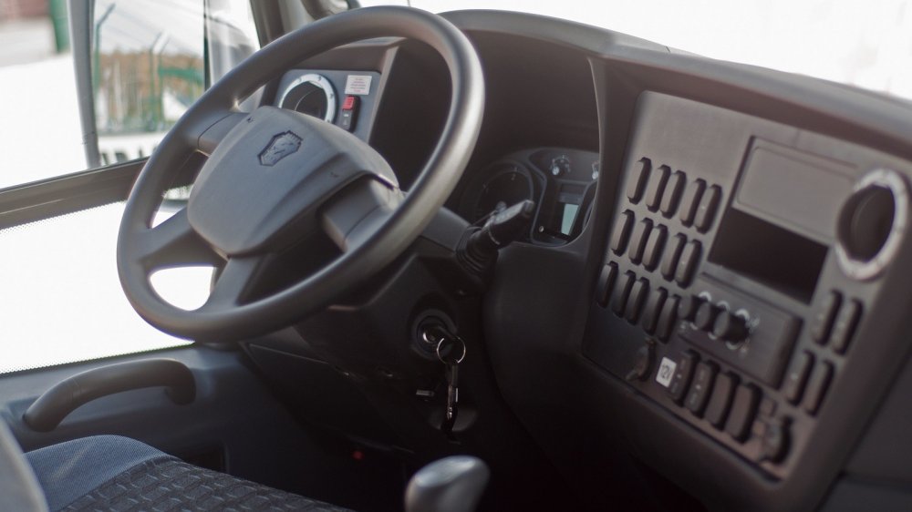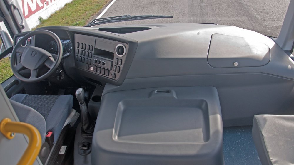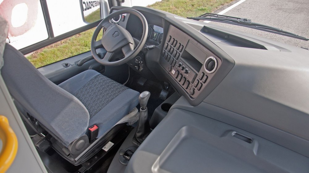 Разворот правой части панели к водителю — автобусная классика, и она удобна. Так же, как и расположение рычага КПП и стояночного тормоза. На мой взгляд, тут ими пользоваться удобнее, чем на родственных Вектору грузовых автомобилях.