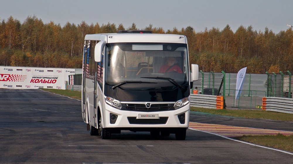 У меня была прекрасная возможность проверить ходовые качества автобуса на известном Нижегородском кольце — трассе для проведения соревнований по автомобильным кольцевым гонкам и шоссейно-кольцевым мотогонкам. Разгоняться на автобусе там негде, слишком много поворотов, а автобус — не гоночный болид, и тем более не мотоцикл. Да и конусов для маневрирования организаторы не не пожалели. Зато на такой дороге как нельзя лучше можно проверить манёвренность автобуса. Итак, что мы имеем?