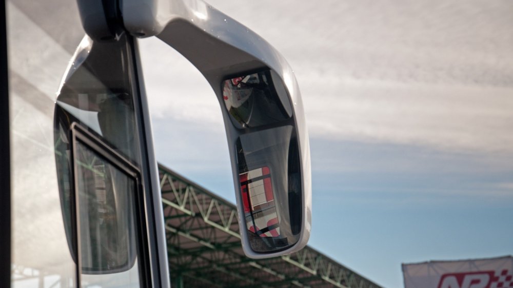 Вообще дизайн автобуса интересный, и тут смогли не только наконец-то сделать что-то красиво, но и практично. Например, обратите внимание на боковые зеркала заднего вида. Раньше разные зеркала были предметом фетиша исключительно владельцев Мерседесов в кузове W124, а теперь вот они — несимметричные зеркала на автобусе. Как потом мы с вами выясним, это очень удобно.