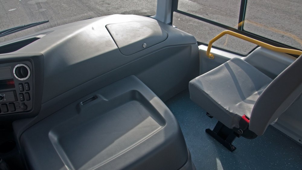 На первый взгляд, интерьерчик довольно унылый. Серый пластик, всё смотрится несколько грубовато и излишне утилитарно. Но бог с ним, может, автобусу большего и не надо.