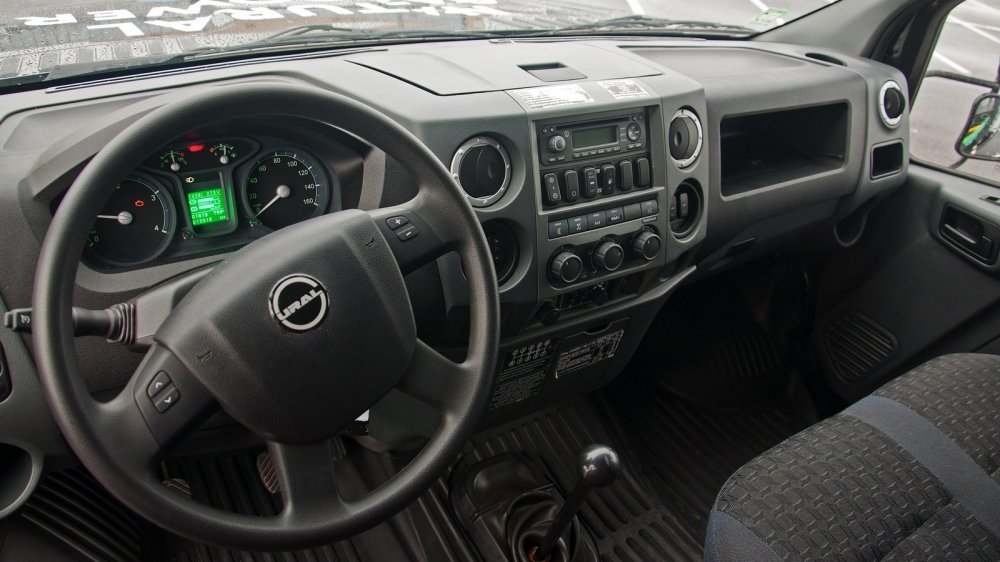 Сиденье очень легко подогнать под любого водителя, настроек хватает. Да и сидеть в нём удобно. Рулевое колесо выглядит небогато, но и его держать в руках приятно, ведь мы помним, что сидим в грузовике-внедорожнике, а тут и требования к рулю другие. Одно дело держаться за этот руль, а другое — отмывать его после своих грязных лап: мало ли куда тебя судьба закинет, бывает разное. А в Урале судьба может закинуть вообще чёрт знает куда, где и руки помыть негде.