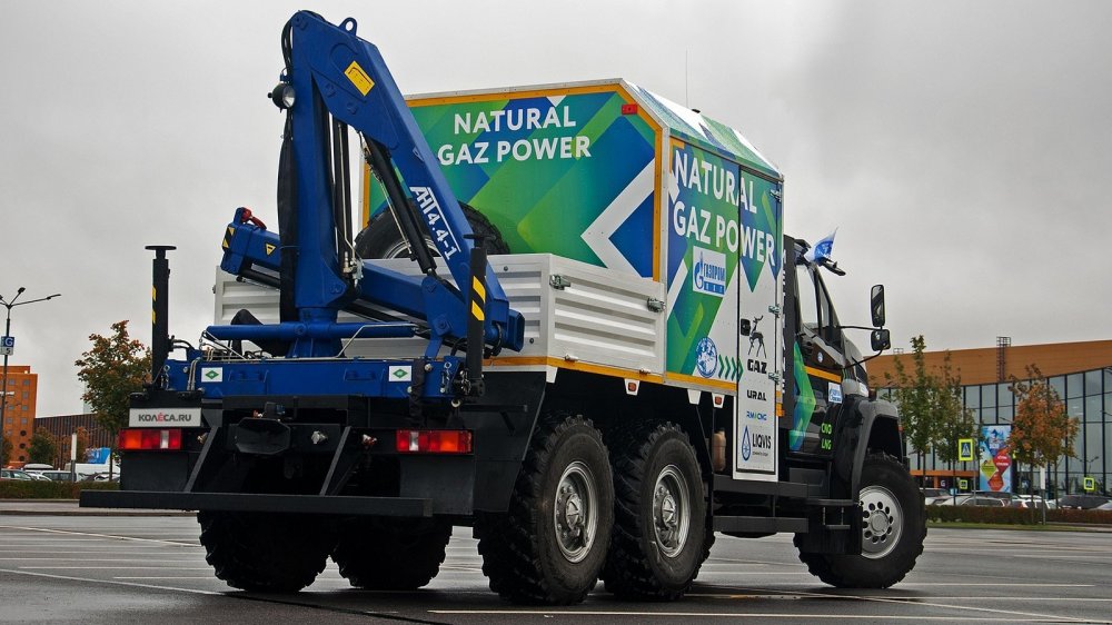 Сначала пропоём минутку дифирамбов газу как топливу. Во-первых, газ дешевле тяжёлого топлива, и это — самое важное. Второе — выбросы оксидов азота и углеводородов существенно ниже, чем у дизельного мотора (на 66% и на 89% соответственно). Ну и, наконец, третье: запас хода у газового Урала NEXT составляет одну тысячу километров.