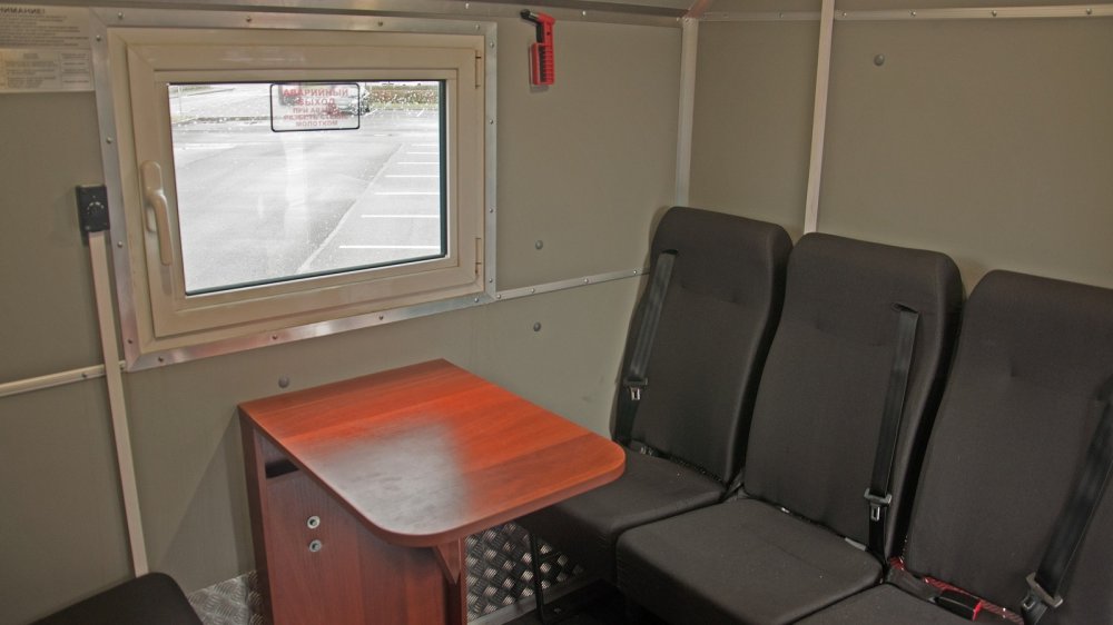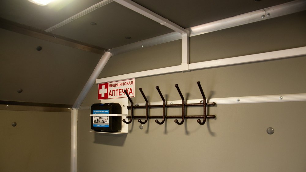 Внутри для мастерской неожиданно уютно. Этому способствует удачное, на мой скромный взгляд, зонирование внутреннего пространства. Небольшой в целом объём смогли использовать очень рационально и полно. Есть даже вешалка для одежды, что очень удобно. Ещё из самого необходимого присутствует автономное отопление, освещение, шесть посадочных мест, аптечка и даже переговорное устройство для связи с теми, кто едет в кабине рядом с водителем.