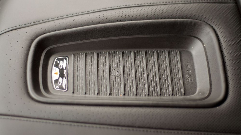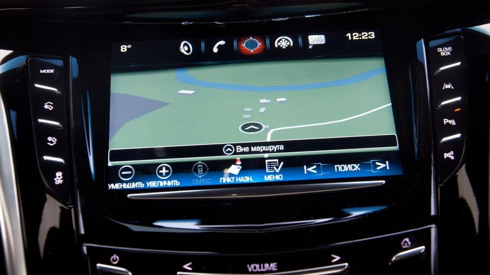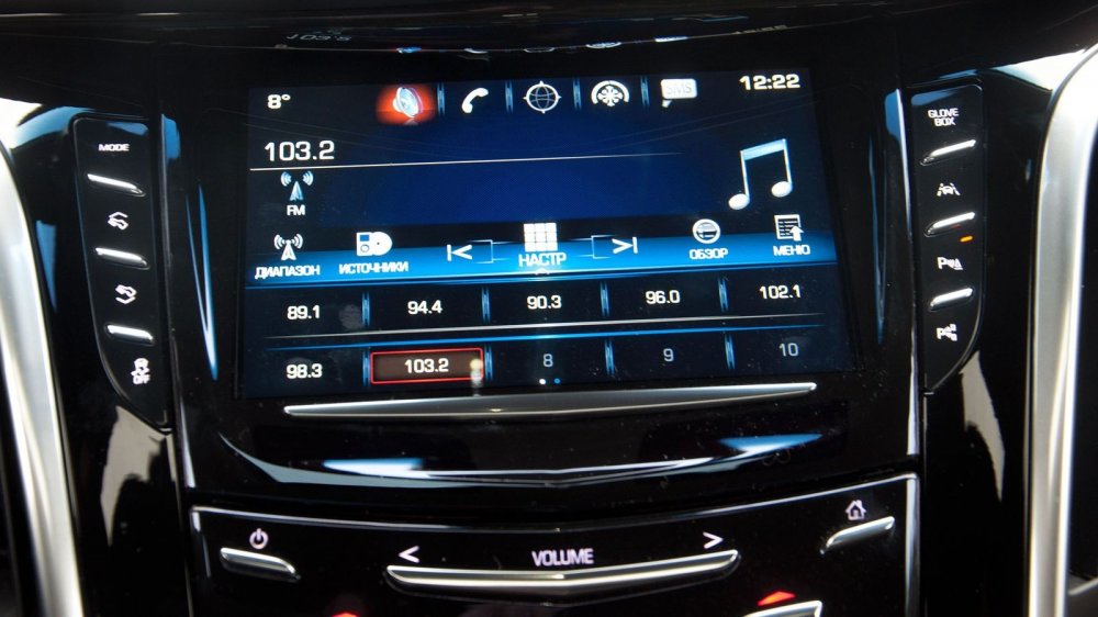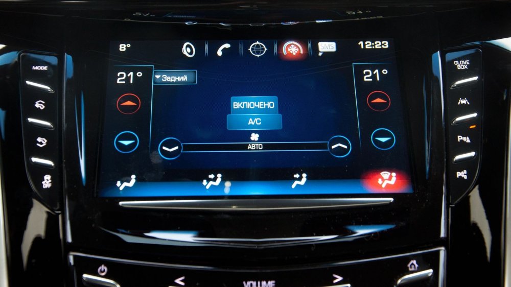 Интерьер Escalade почти столь же самобытен, как и его экстерьер. Если закрыть глаза на глянцевый «рояльный лак» центральной панели, то он действительно шикарен. Очень неожиданно встретить алькантару на дверных панелях и особенно – на нижней части передней панели и крышке перчаточного ящика. Допустим, дверные карты иногда ещё стараются сделать красиво, а вот материалы панели сейчас всё чаще выглядят не как пластик «под дерево», а как пластик «под мягкий пластик». Алькантара сразу даёт понять, что перед нами не простой автомобиль, а почти три тонны премиальной марки. Мы ещё посмотрим интерьер внимательнее (там очень много интересных деталей), когда сядем за руль. А сейчас займёмся наиболее интересной частью Кадиллака – его техникой.