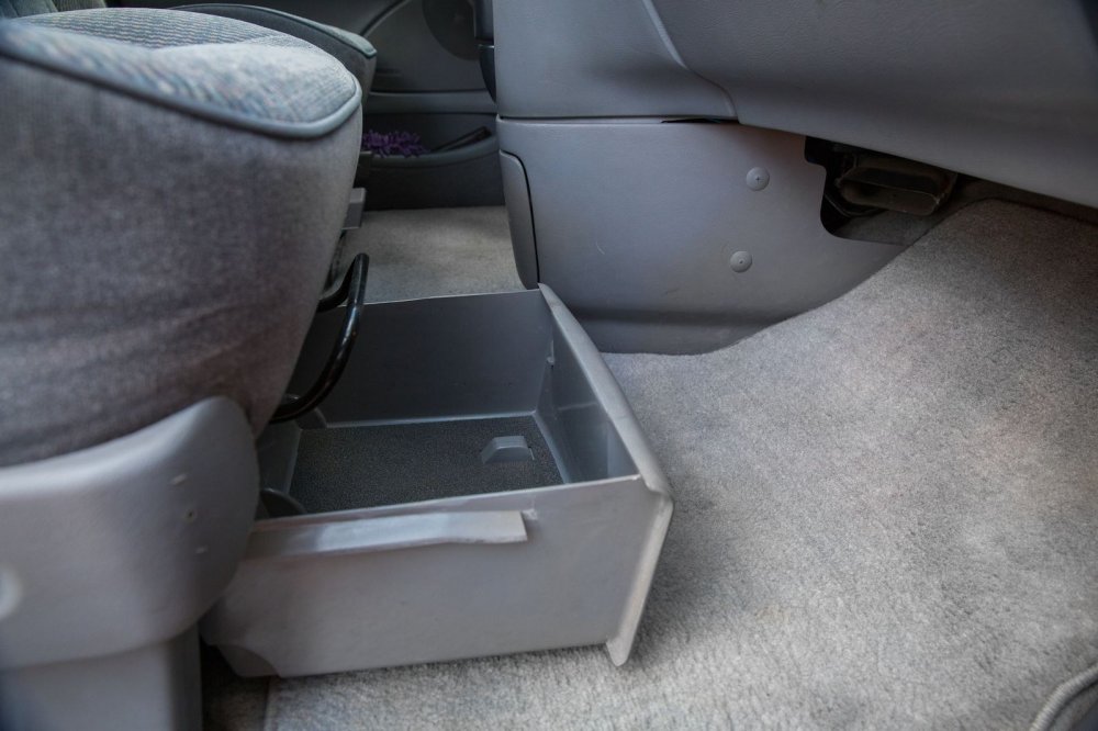 Разными нишами и емкостями под вещи Виндстар, как ни странно, не слишком богат. Объем бардачка довольно скромный, зато есть весьма изрядный лоток под аудиокассеты. Имеется выдвижной подстаканник на два гнезда, карманы в дверях и выдвижной ящик под передним пассажирским сиденьем.