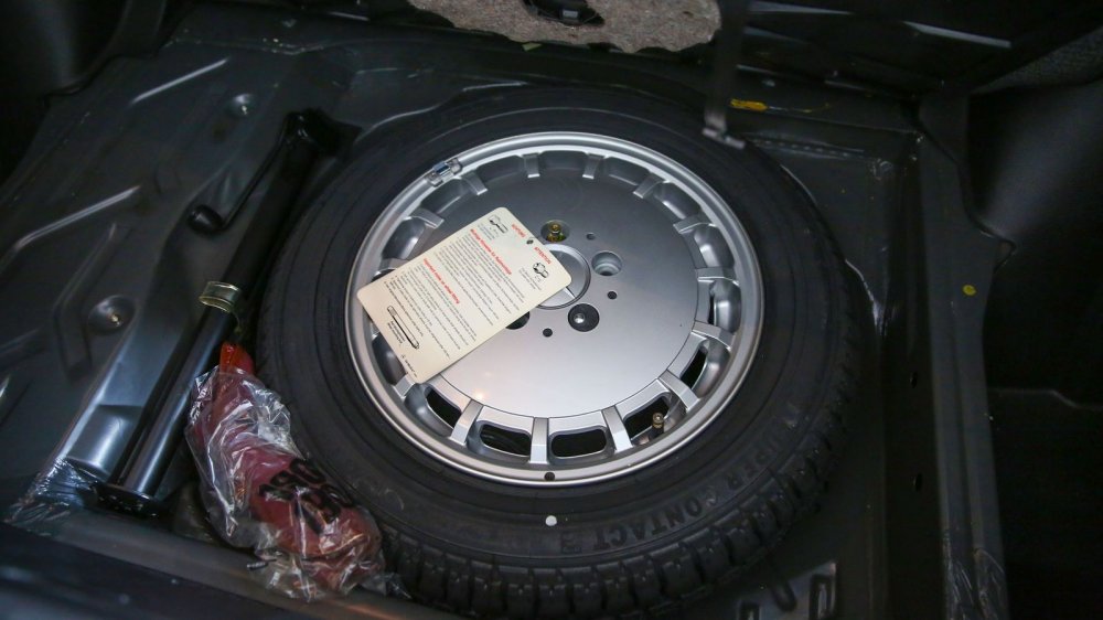 Оригинальные легкосплавные диски обуты в резину R15 186/65 Continental Super Contact. Эта модель шин уже много лет не выпускается, но в багажнике лежит новенькая, ни разу не надетая запаска на полноразмерном диске.