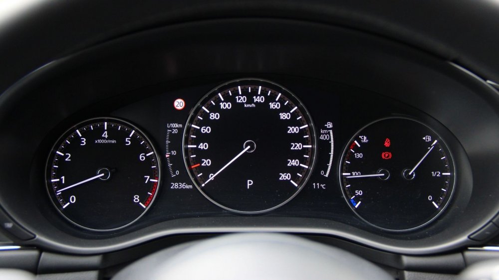 Конфигурацию щитка приборов Ceed тоже целиком «стащил» у Гольфа – лаконично, но скучно. В Мазде щиток интереснее, с нарисованным на экране, но фотореалистичным центральным спидометром. Риски меняют цвет с белого на красный в зависимости от текущего ограничения скорости, а превышение наглядно отображается в виде дорисовываемого красного сегмента шкалы – на мой взгляд, это самое гармоничное применение цифровых технологий в эргономике щитка из тех, что я видел.