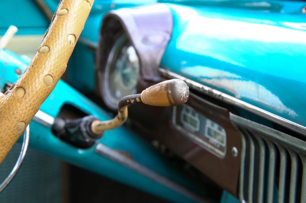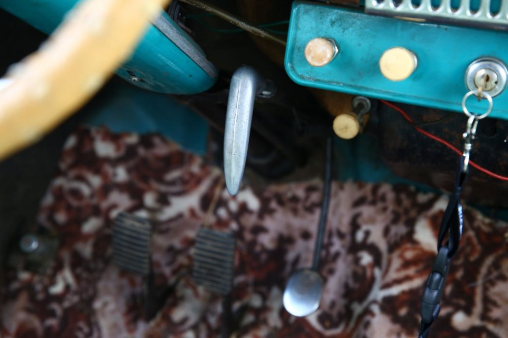 Рычаг КП – тоже на рулевой колонке. Кривая рукоятка сообщает о наличии 4-ступенчатой коробки, ибо на более ранней, 3-ступенчатой, рукоятка была прямой. Дуга из толстой никелированной проволоки под рулем – выключатель клаксона, сигнал заработает, если потянуть ее на себя. С непривычки – очень неудобно.