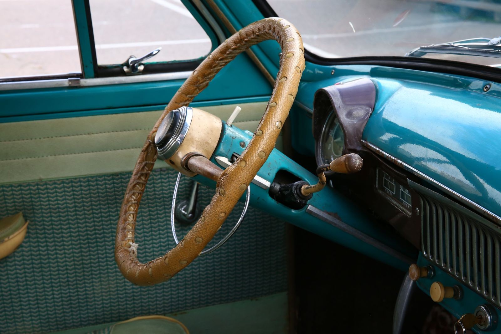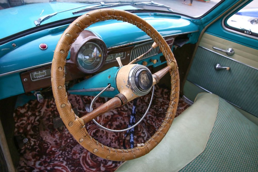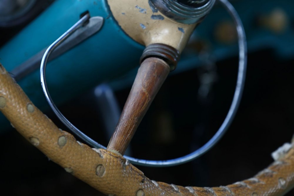 Руль автомобиля (как видимые спицы, так и скрытый под декоративным чехлом обод) по виду напоминает потрескавшееся дерево. На самом деле это, разумеется, не древесина, а старинная разновидность пластиков – галалитов. «Полимеры», сделанные на основе органических наполнителей (костной муки, целлюлозы и т.п.), со временем разрушались с характерным растрескиванием. Впрочем, риска отрыва «баранки» не было – внутри пластиковых деталей проходит металлический каркас.