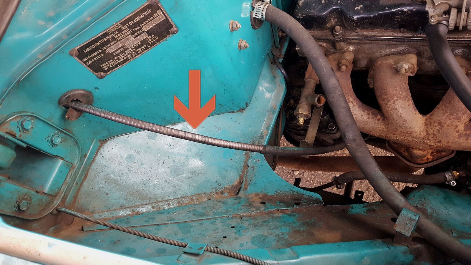 Вот, к примеру, толстый тросик, идущий от блока цилиндров двигателя через моторный щит куда-то в салон. Это… привод дворников! Вместо отдельного электромоторчика крутящий момент на систему стеклоочистителей подает непосредственно распредвал двигателя. В блоке цилиндров сделан небольшой «вал отбора мощности» (по сути, идентичный тому, что приводит в движение трамблер), а в салон уходит от него гибкий «боуден». Тросик вращается постоянно, а когда водителю нужно включить стеклоочистители, он небольшой рукояткой замыкает крошечную муфту – эдакое «микро-сцепление», подавая крутящий момент на трапецию дворников! Подобная система способна породить взрыв мозга у современного автовладельца! Мало того, что дворники нельзя включить, пока не запущен двигатель, так еще и скорость их перемещения по лобовому стеклу напрямую зависит от его оборотов! Усилился дождь или снег? Поддай газку!