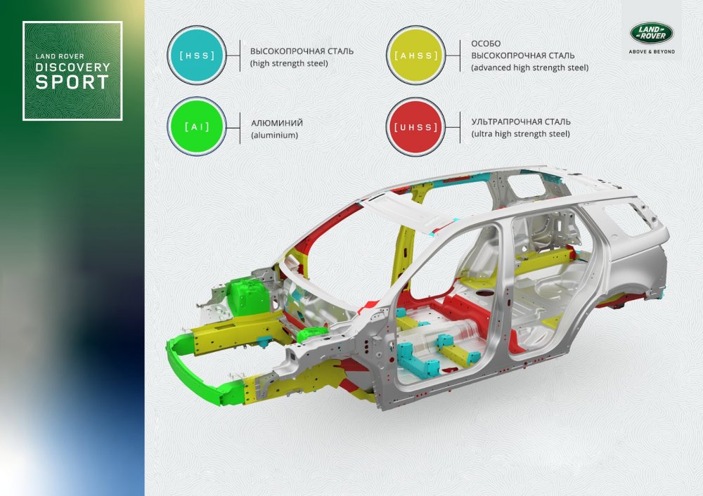 Подобно Эвоку, Discovery Sport потяжелел: если первый весит минимум 1 800 кг, то снаряжённая масса «Диско» по стандарту DIN – 1 979 кг для бензинового и 2 009 кг для дизельного. Одной из причин можно считать ограниченное применение алюминия. Из него, как и раньше, изготовлены внешние панели – крыша, капот и багажник, но старый кроссовер весил 1 863 кг, а сейчас, с новой гибридной схемой, которая заставляет возить с собой дополнительное оборудование и батарейку, снаряжённая масса стала больше. Разумеется, инженеры Land Rover объясняют «потолстение» ещё и выросшими возможностями по части пассивной безопасности: кузов стал жёстче на 13% и в целом лучше держит удар.