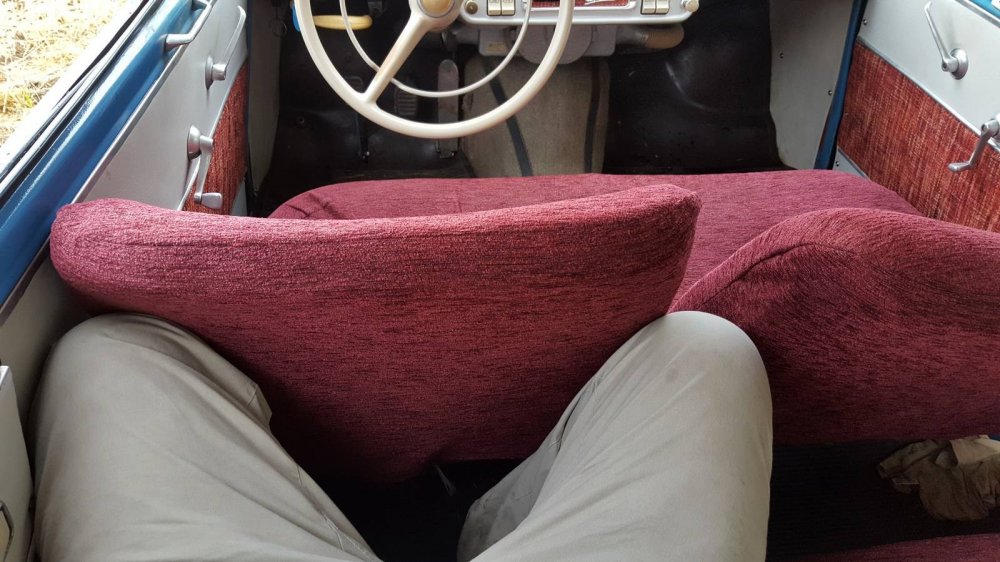 Переднее сиденье имеет сплошную подушку, но раздельные спинки – для удобства попадания на второй ряд. Интересно, что оси шарниров, на которой откидываются вперед спинки, как бы перекошены. Но это не деформация, а задумка – так спинка лучше открывает проход на заднее сиденье. Впрочем, при возможности туда лучше не попадать вовсе, если поездка превышает четверть часа – хоть там и олдскульно уютно, но для взрослого очень уж тесно...