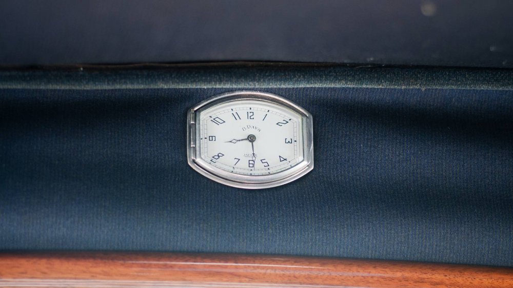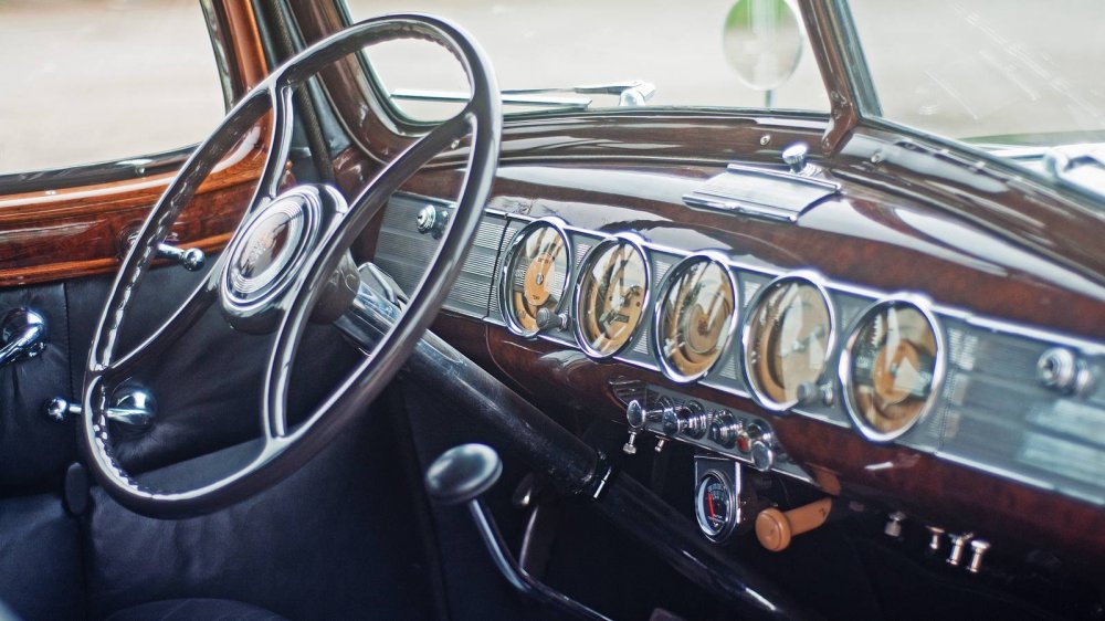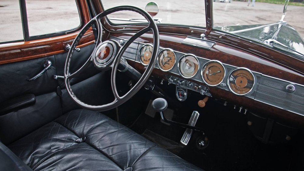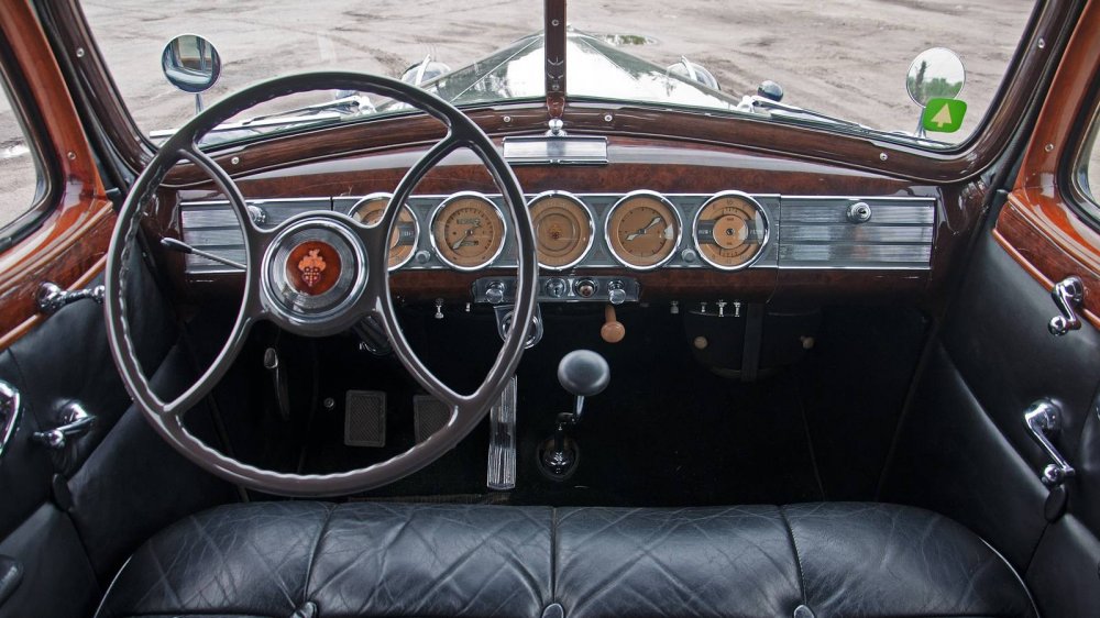 Приборная панель у Twin Six — это шедевр. У машин с моторами скромнее панель была другая, тоже попроще. А вот у этого лимузина она просто шикарная. Приборы стоят не перед глазами водителя, а по центру. Может, это очень красиво, но не очень удобно — крайние справа из-за руля видно плохо. А вот центральная шкала — это вообще не прибор, а просто оформленный под него логотип Паккарда.