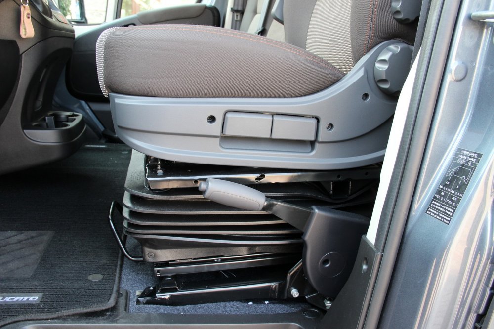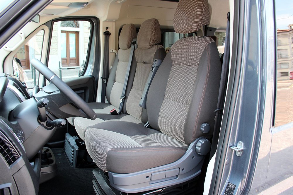 Теперь пересаживаемся на 8-местный микроавтобус с высокой крышей и топовым силовым агрегатом: как раз тем самым 2,3-литровым 180-сильным дизелем и 9-ступенчатым автоматом. Кресло водителя здесь – словно из магистрального тягача: с множеством регулировок и системой амортизации, но последняя для Ducato мне показалась избыточной: она разобщает водителя с автомобилей, так как подвеска колёс работает в одном ритме, а подвеска кресла – в другом, и для вестибулярного аппарата такой диссонанс не очень приятен. Имеющаяся регулировка поясничного подпора даже в нулевом положении слишком сильно давит на спину, и кручение соответствующего колёсика лишь увеличивает это давление.