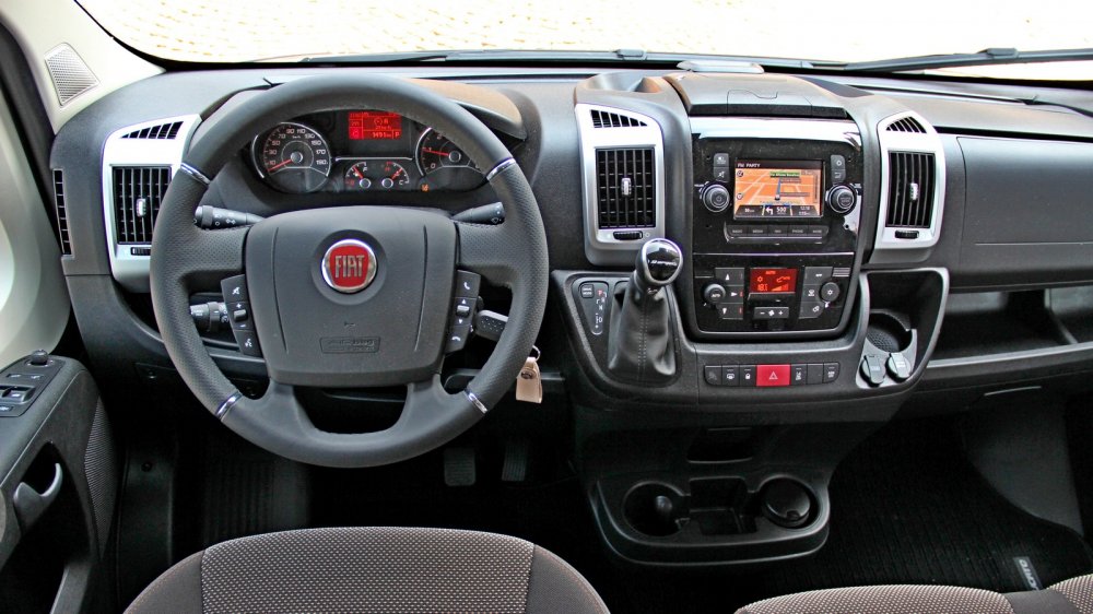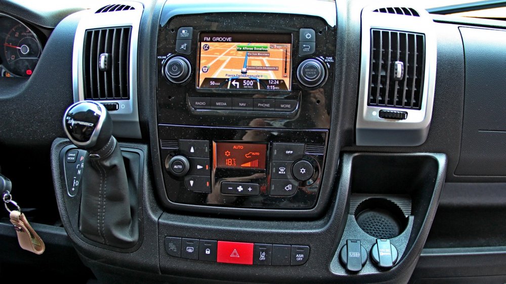 На Ducato 2020 модельного года в виде опции предлагается новая мультимедийная система с 7-дюймовым сенсорным экраном Mopar, поддерживающим смартфонные интерфейсы Apple CarPlay и Android Auto. Встроенная навигация при прокладке маршрутов может учитывать габаритную длину автомобиля и избегать слишком узких и крутых улочек. Увы, оценить её работу нам не удалось – тестовые автомобили были снабжены старенькой «мультимедией» Uconnect с маленьким 5-дюймовым экраном, топорной графикой и примитивной навигацией TomTom. Но у этой системы есть редкие по нынешним временам достоинства: она очень шустрая и мгновенно реагирует на касания, «горячие» физические клавиши позволяют сразу попасть в нужный раздел меню, традиционной «крутилкой» регулировки громкости можно пользоваться, не отрывая взгляд от дороги. Штатная аудиосистема, к слову, даёт вполне сносный звук, навигация по папкам и альбомам с USB-флэшки простая и понятная.