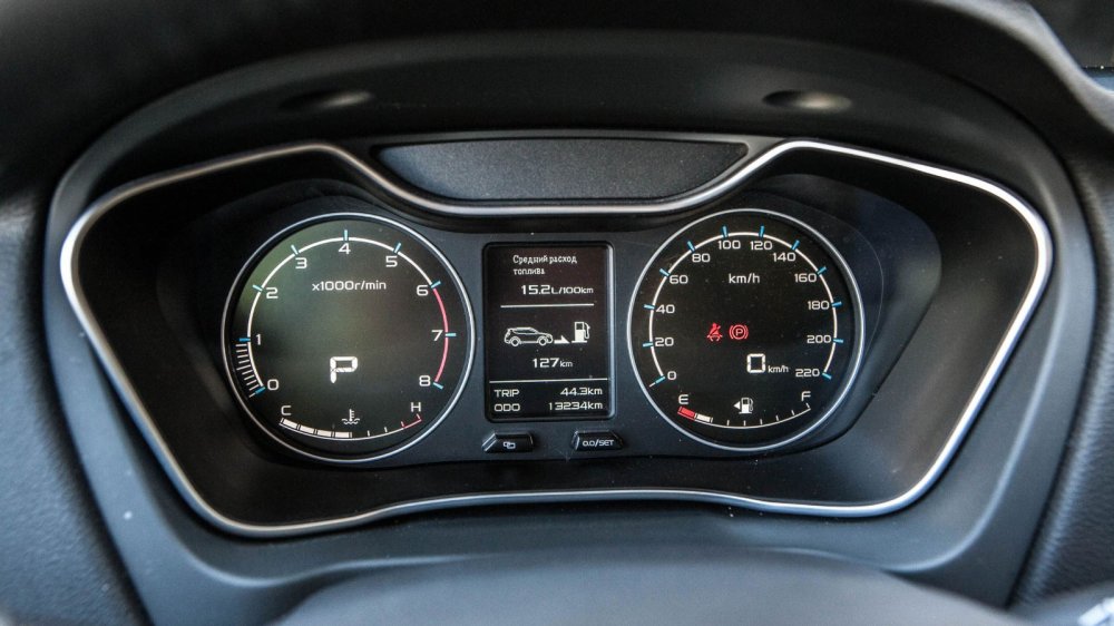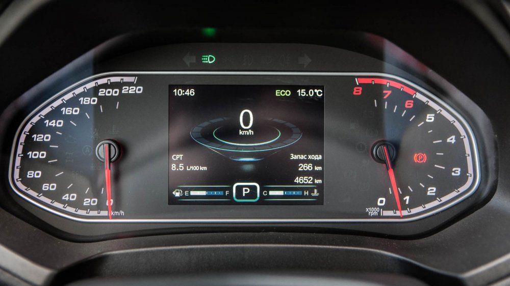 Шкалы приборов в Tiggo 7 почему-то вызывают устойчивые ассоциации с циферблатами в Lifan X70, хотя у «китайца» из Чунцина они круглые, а в Tiggo 7 – многогранные. Зачем нужно было городить огород и что-то изобретать, ведь в Tiggo 5 были пусть и простоватые, но всё-таки хорошо читаемые шкалы. С другой стороны, в Tiggo 7 по крайней мере есть самые настоящие «живые» и натуральные стрелки привычного красного цвета, а вот в нарисованных циферблатах Geely лишь заполняется часть шкалы по мере того как обороты и скорость растут. Зачем, для какой красоты это сделано, опять же, непонятно: читаемость шкал в Emgrandе на низком уровне. По счастью, на спидометре скорость дублируется привычным образом – в числовом виде.