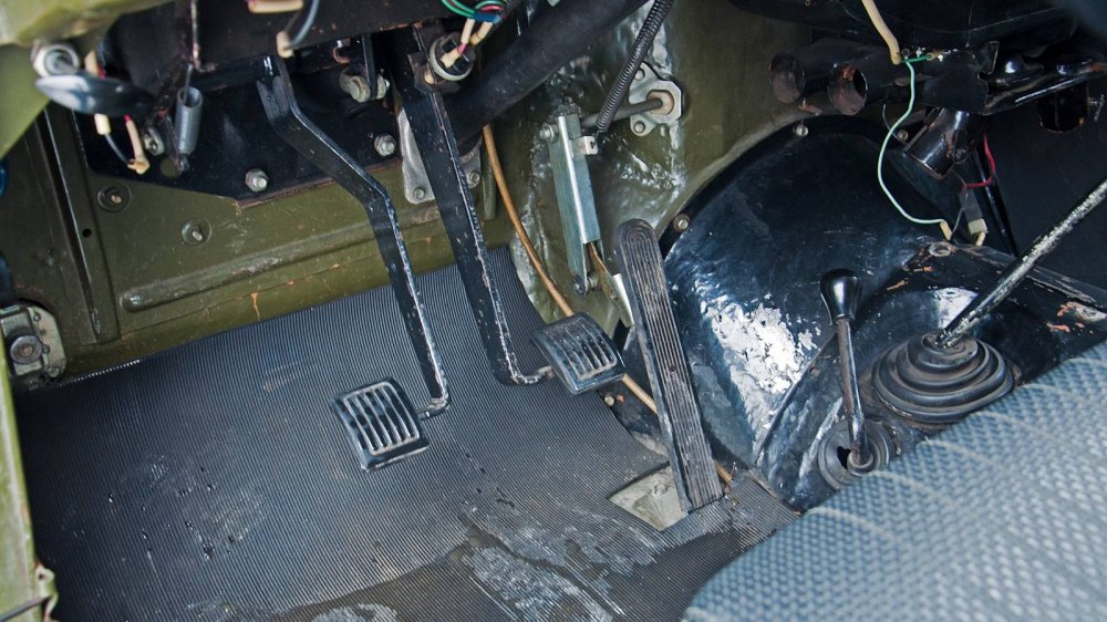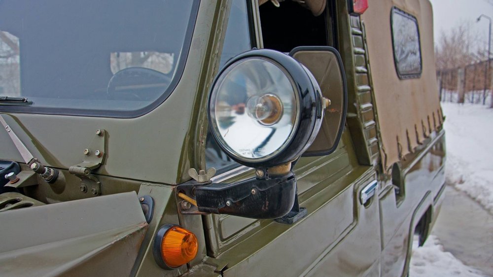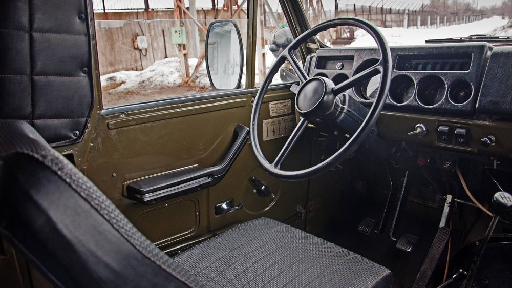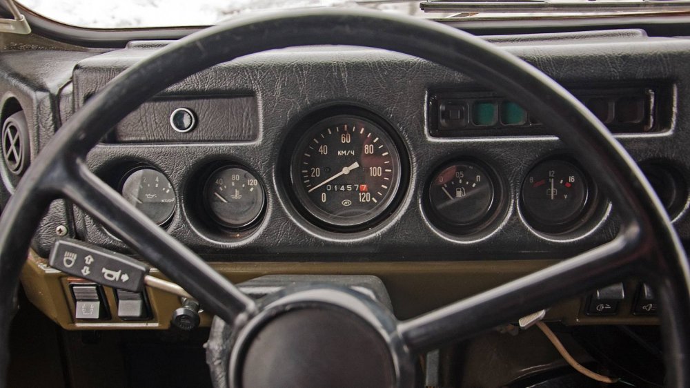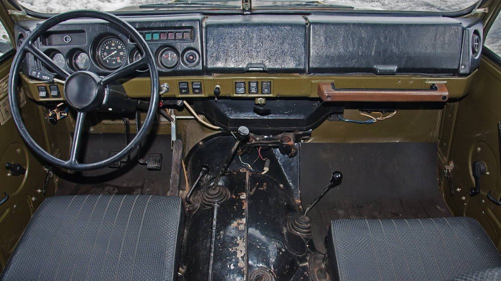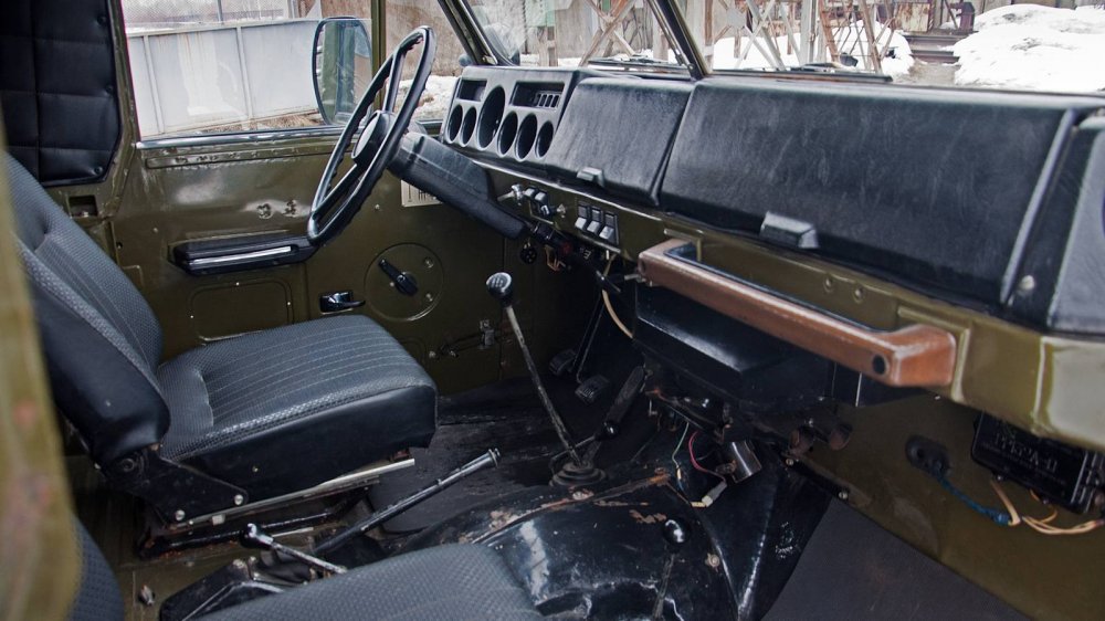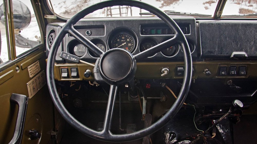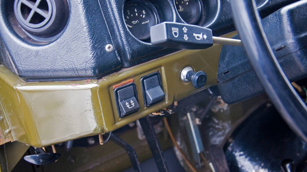 Передняя панель “Ягуара” по сравнению с панелью “бобика” — просто лакшери. Видимо, не зря его назвали “Ягуаром”. Не могу сказать, чем объяснить такую щедрость конструкторов, но сделали они её неприлично красиво для армейской машины. Представляете, тут есть пластик! И приборы стоят в колодцах. Сами-то они обычные — указатели давления масла, температуры охлаждающей жидкости, спидометр, уровень топлива и вольтметр, но и расположены удобно, и выглядят симпатично. Зато замок зажигания тут без ключа. Его роль выполняет “флажок”, который стоял на многих военных машинах СССР.