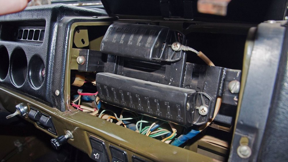 В центре приборной панели стоит блок предохранителей. И это удобно: тут его и водой не зальёт, и при необходимости можно быстро заменить сгоревший (а ещё — намотать “жучок” или воткнуть монетку, что для УАЗа многие считают нормой). Справа, прямо перед пассажиром — ручка с намёком на нежность. Почему-то обычно они были просто металлические, холодные и жёсткие, а тут она мягкая. Господи, как этим военным повезло…