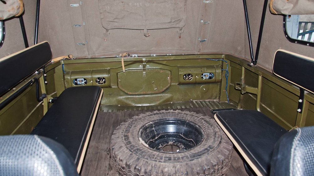 Пассажирам заднего отсека повезло меньше. У них есть достаточно жёсткие скамейки вдоль бортов и плафон освещения. В ногах им мешается запасное колесо, а держаться в случае чего можно только друг за друга.