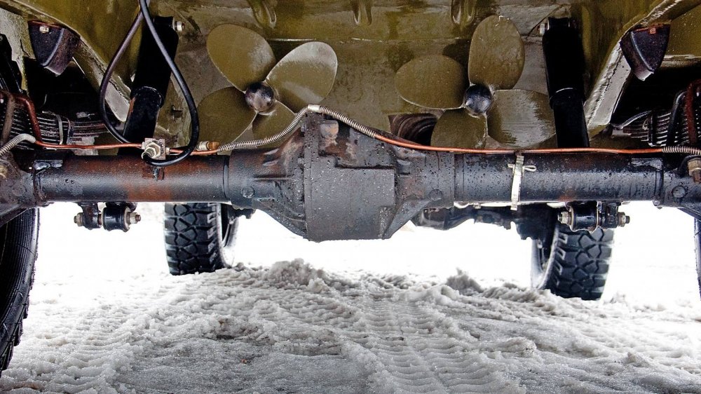 Понятно, что большинство различий было продиктовано необходимостью построить плавающую машину. В качестве движителей решили использовать гребные винты, а для этого нужно было спроектировать не только эти самые винты, но и коробку отбора мощности для них. А ещё — рули, помогающие управлять машиной на плаву.