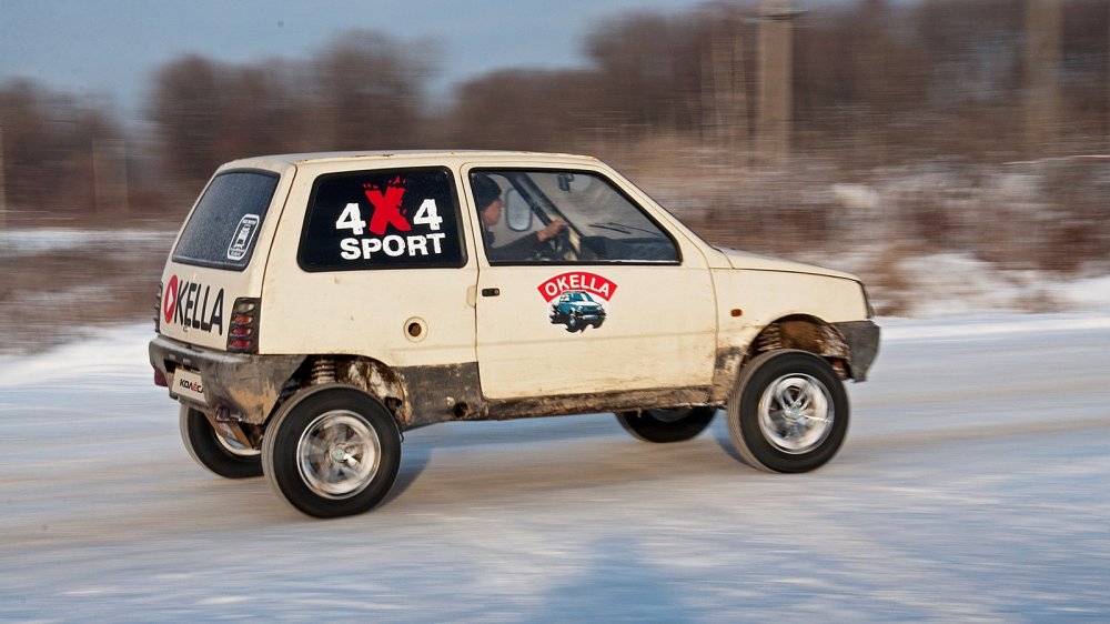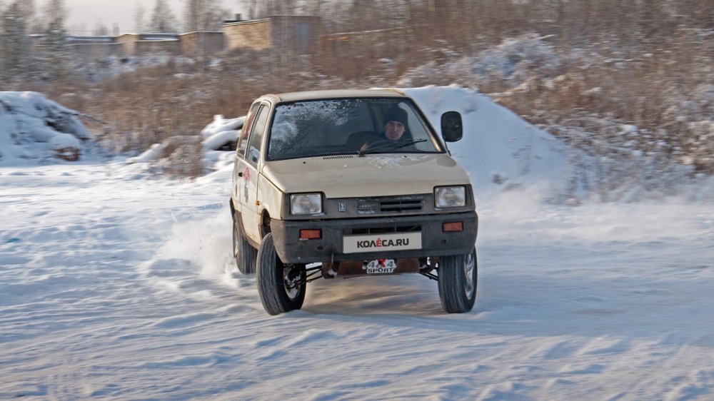 Второй вариант — запустить задний мотор, а передний заглушить. Или просто оставить его коробку на нейтральной передаче. И тогда Ока едет как… Ну, приблизительно как жигулёвская “классика” — не очень шустро, но в поворотах на снегу можно подрифтить.