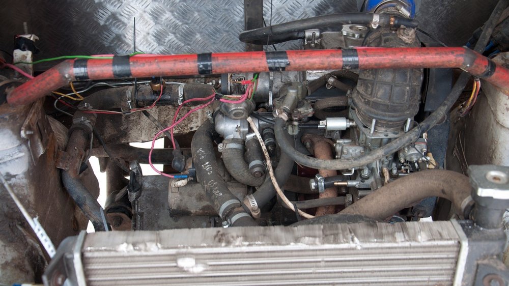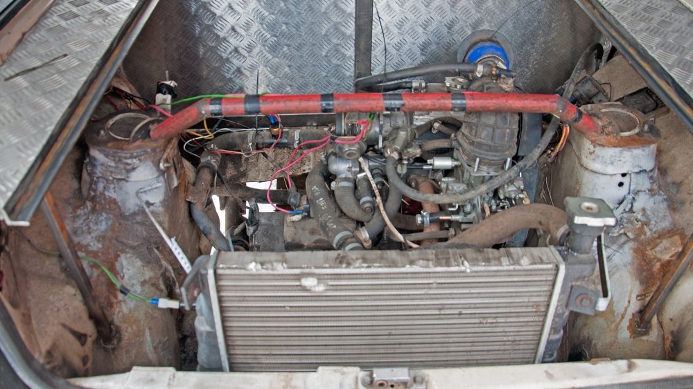 Итак, кузов переварили. Зачем? Затем, что сзади должен стоять силовой агрегат от ещё одной Оки. Именно силовой агрегат — мотор, коробка и сцепление. Ну, а кроме них — и приводы. Для этого в багажник Оки вварили переднюю часть кузова донорского автомобиля. После этого можно было ставить второй двигатель. Который, правда, сначала пришлось “откапиталить” — он бессовестно жрал масло. Больше ничего с моторами не делали, они так и остались теми же 0,75-литровыми ВАЗ-11113 с 33 л.с. в недрах двухцилиндрового блока.