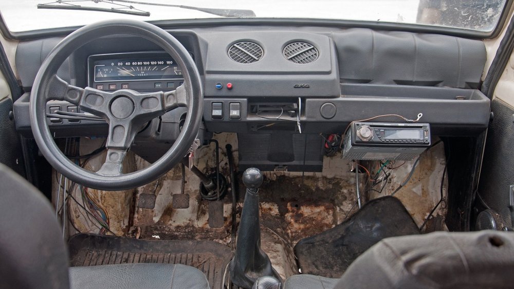 Интерьер описывать не буду — тут почти всё, как у старой раздолбанной Оки. Правда, на панели, справа от руля, есть два дополнительных выключателя: зажигание и кнопка стартера для заднего мотора. Ну и самый цимес — два рычага КП. Один — на штатном месте, другой — чуть сдвинут назад. Как ими работать? Тут есть три варианта.