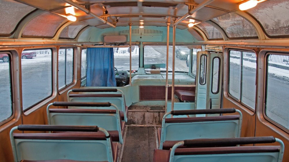 Скажем честно: в салоне смотреть нечего. Тут нет всех этих ваших зарядок “ю-сы-би” и прочих холодильников для пива. Тут есть сиденья с крепкими поперечинами (чтобы не вылететь из автобуса раньше времени) и кнопка вызова водителя (чтобы не вылететь позже). И ещё — классные “вертушки” на сдвижных форточках, так похожие формой на профиль ротора Mazda 13B (если вы понимаете, о чём я). Странно, что эти устройства на автобусе сохранились: обычно они отсюда отваливались в числе первых запчастей, потерянных “пазиком” на дороге.