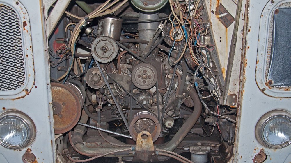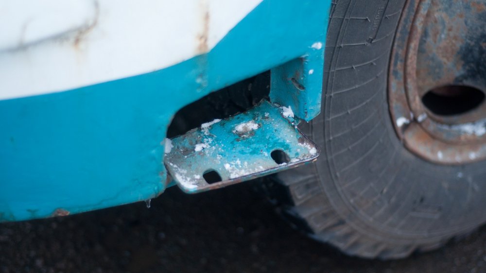 Переднюю решётку можно поднять для доступа к двигателю. Мотор тут, как я уже говорил, от ГАЗ-53. Это олдскульный монстр объёмом 4,25 литра, развивающий 115 л.с. при 3 200 оборотах в минуту и 285 Нм момента при 2 000. Но обратите внимание: на ГАЗ-53 модель этого мотора называется соответственно ЗМЗ-53, а на ПАЗе он носит своё собственное имя ЗМЗ-672. Может, между моторами есть какие-то отличия? Бинго!