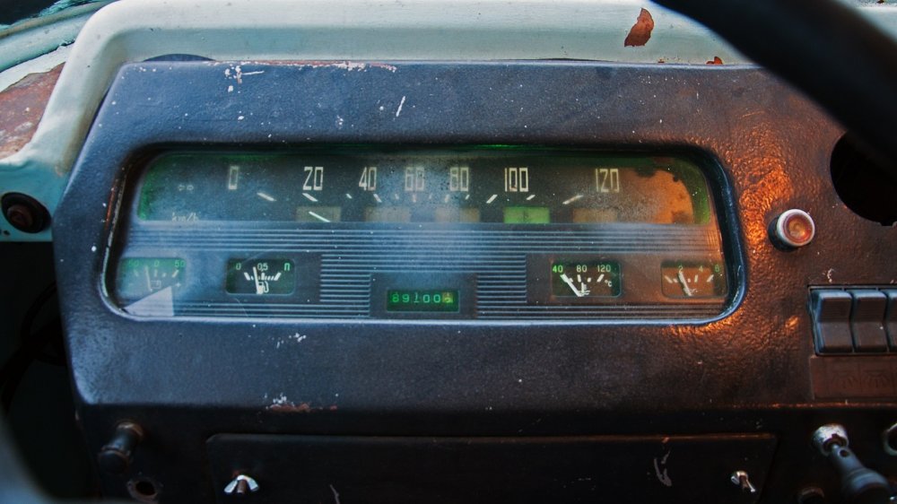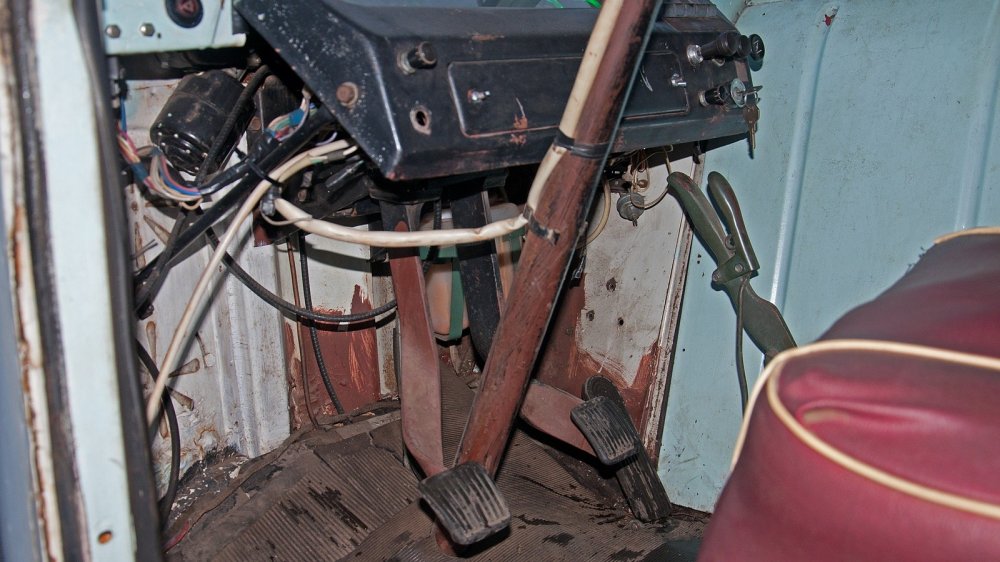 Приборная панель знакомая — такая же стояла и на некоторых 412-х Москвичах. А вот педальный узел тут не “стоковый”: у поздних ПАЗов (к которым относится и наш автобус) рычаги педалей так не “завивали”. Почему здесь стоят именно такие педали — никто не знает.